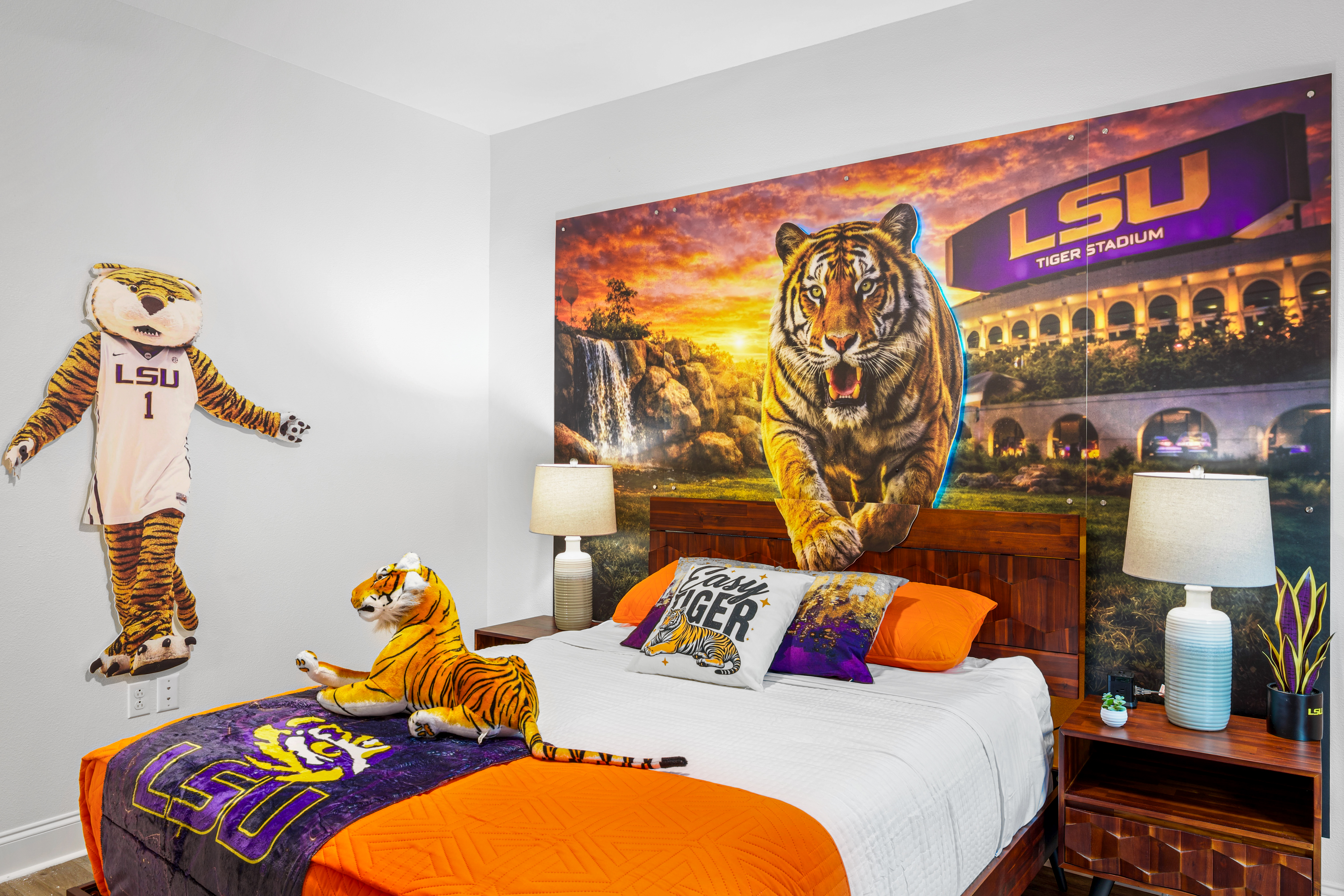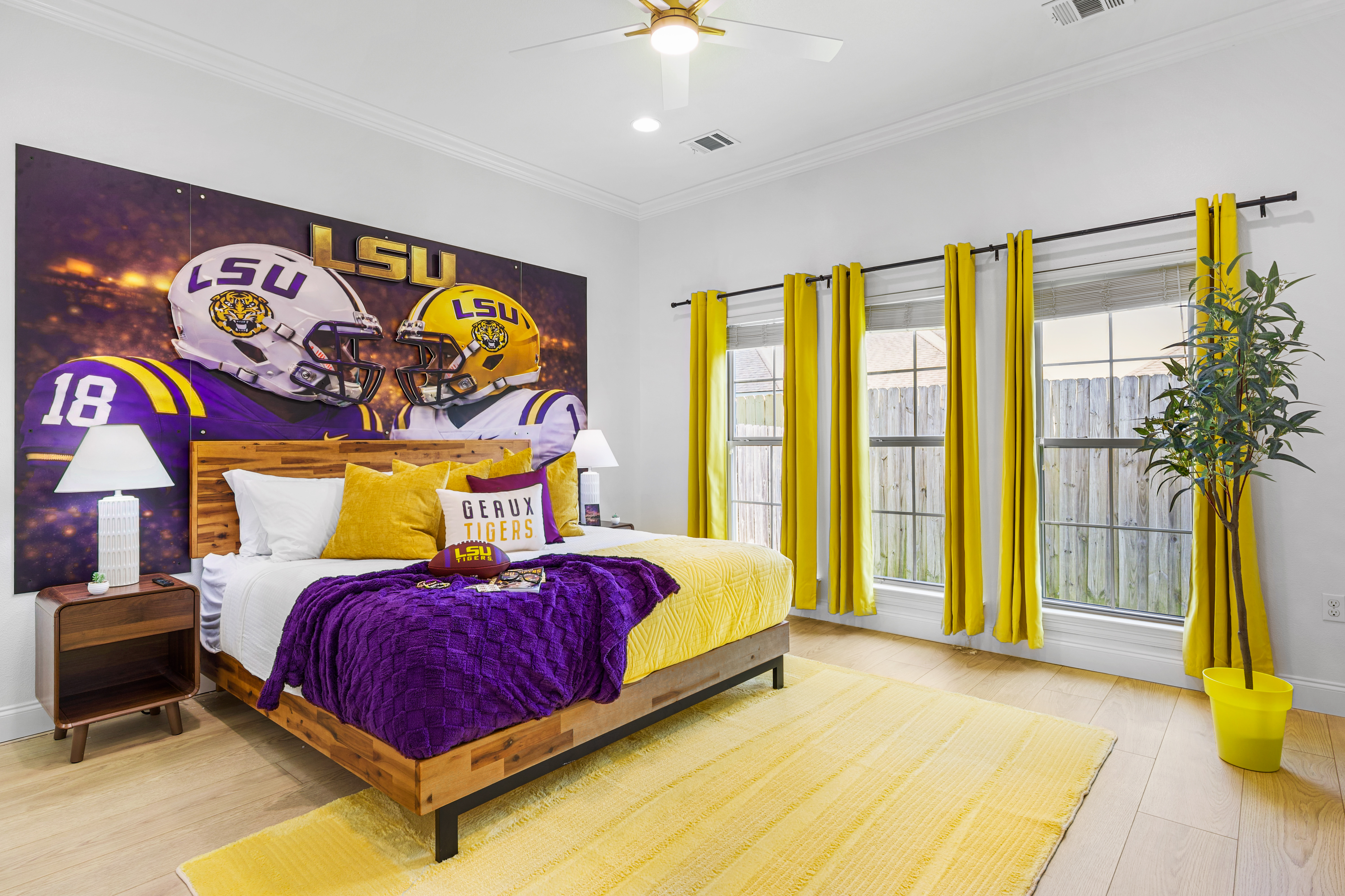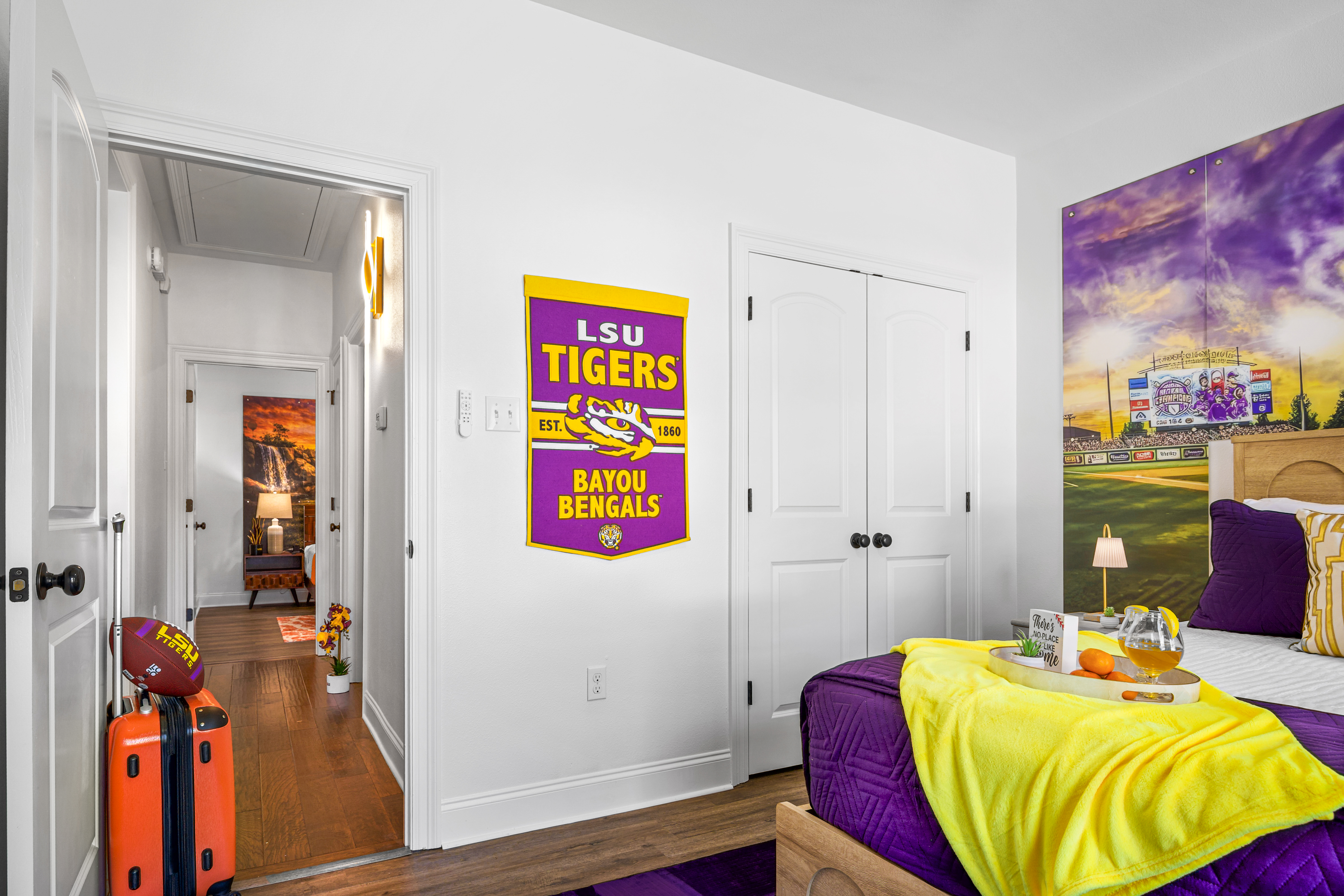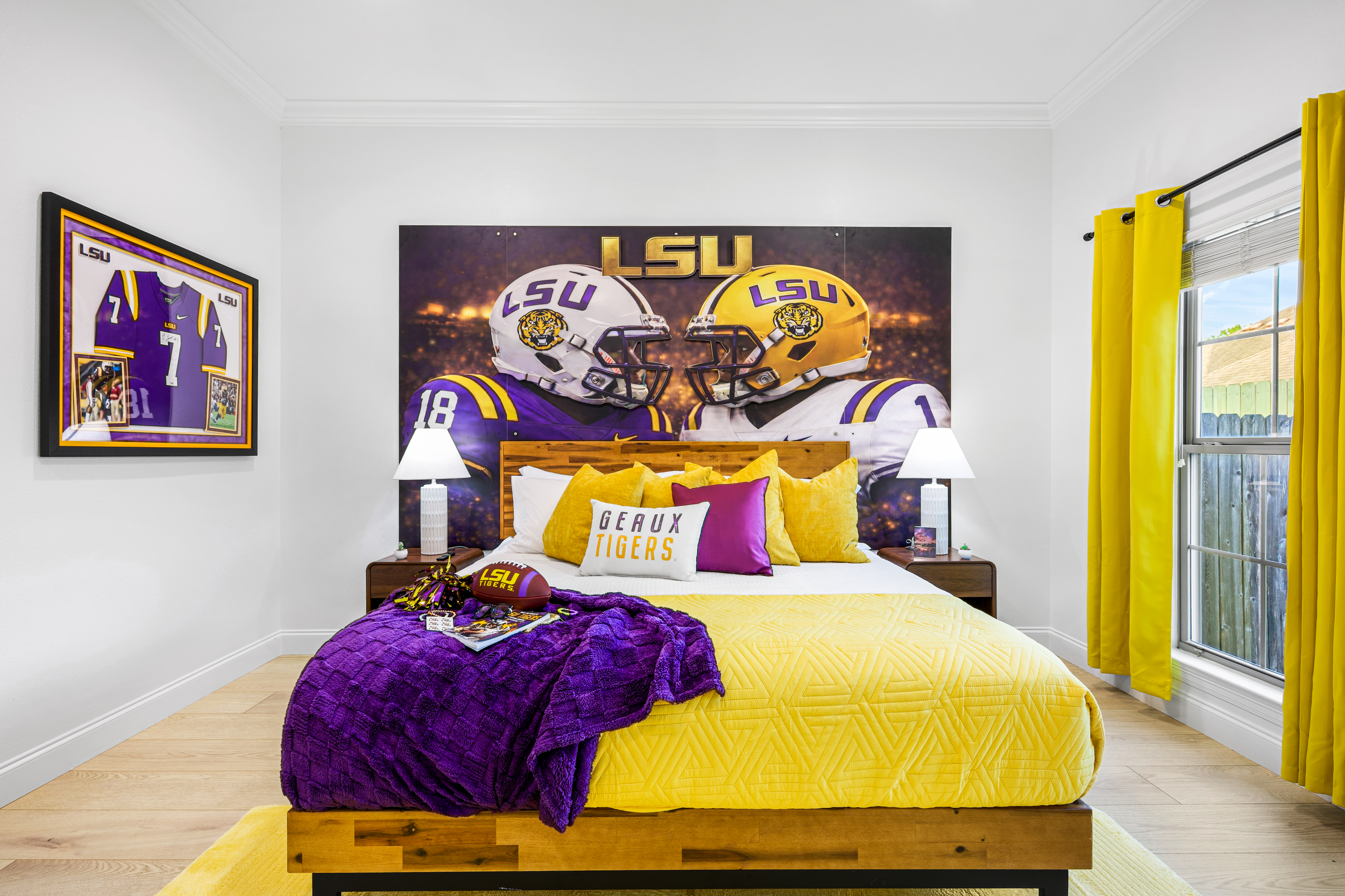 Every bedroom is uniquely LSU-inspired, giving each guest their own Tiger territory. From bold purple and gold accents to custom details that celebrate Baton Rouge spirit, this home fully immerses you to say Geaux Tigers!
