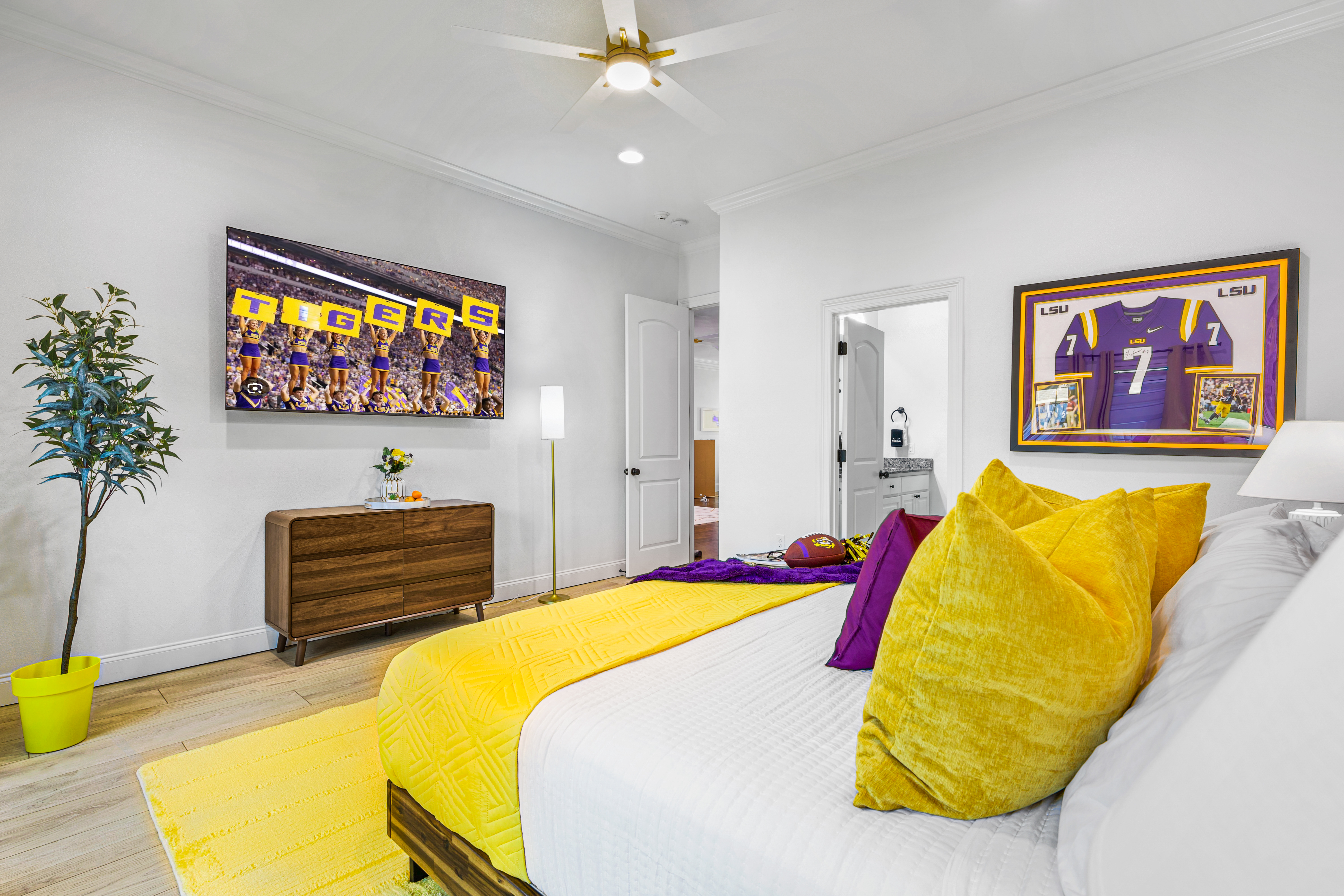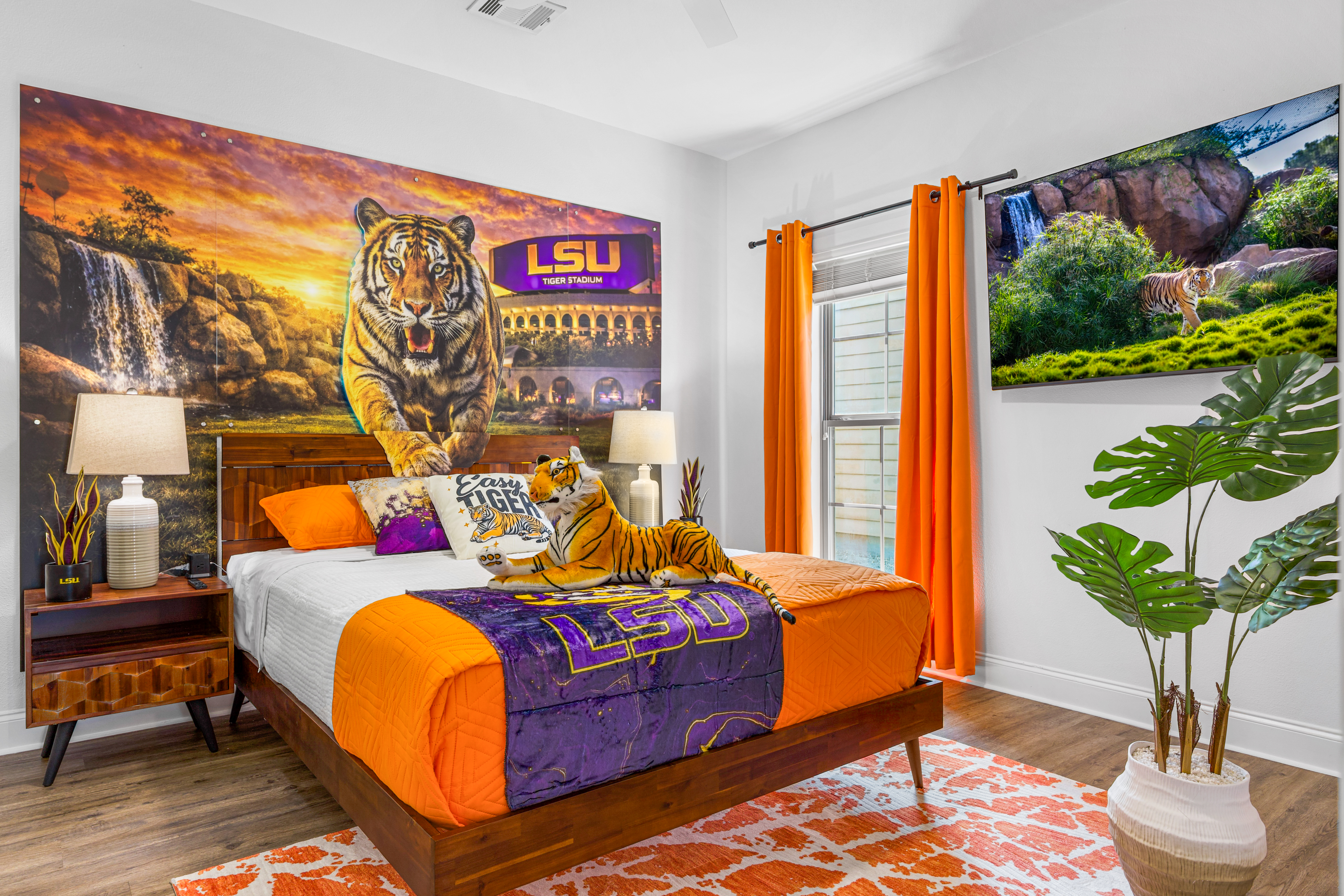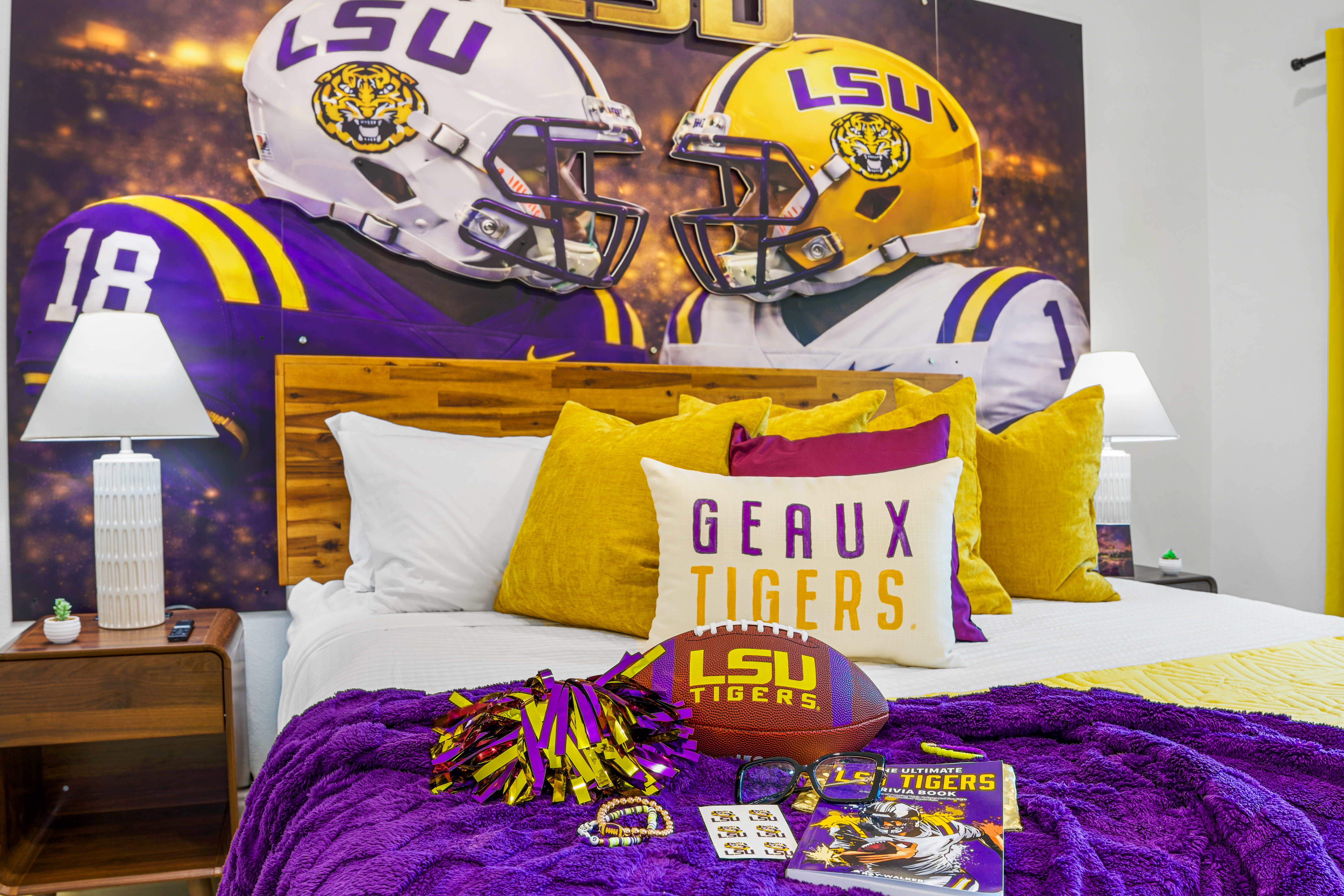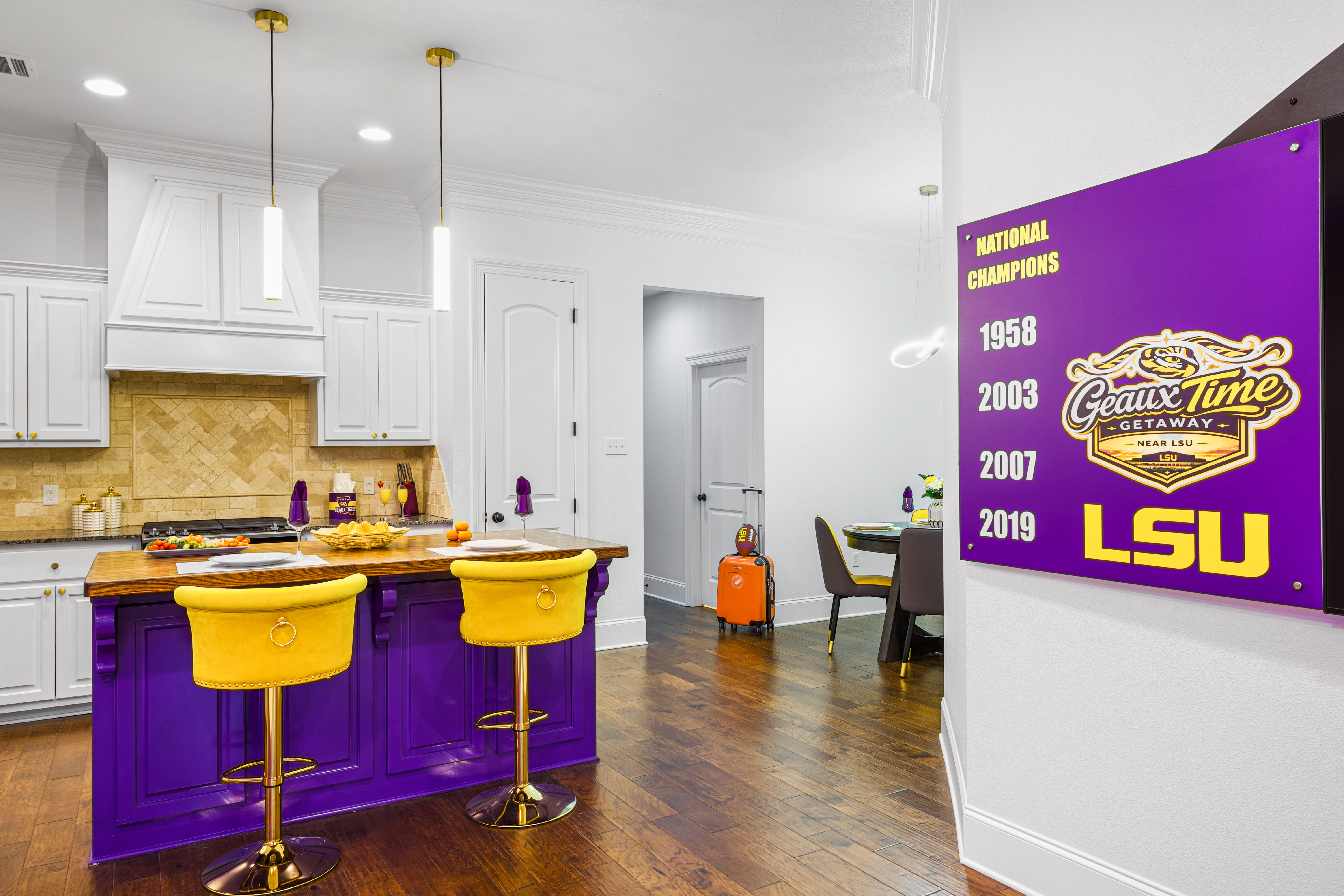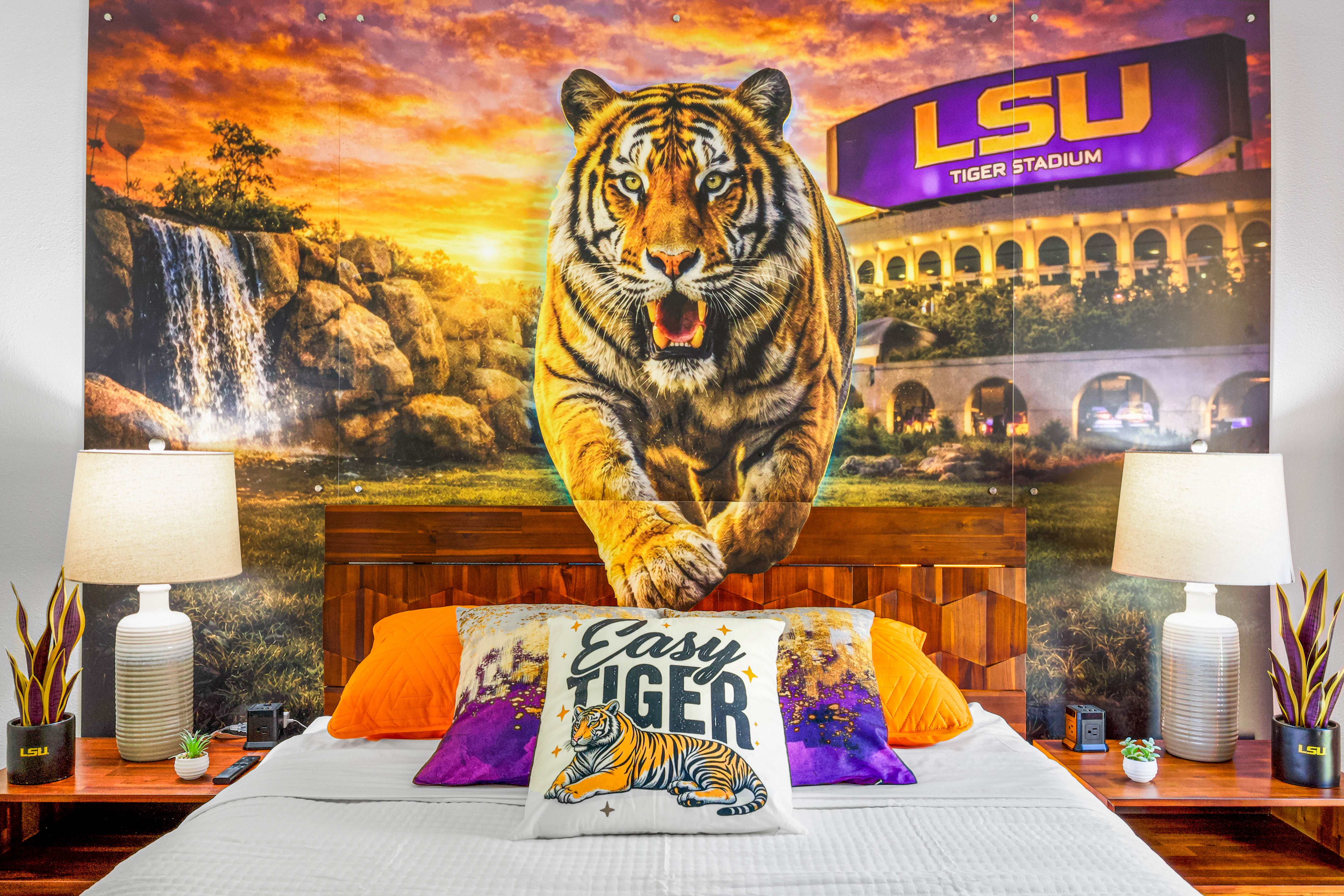 Every bedroom is uniquely LSU-inspired, giving each guest their own Tiger territory. From bold purple and gold accents to custom details that celebrate Baton Rouge spirit, this home fully immerses you to say Geaux Tigers!