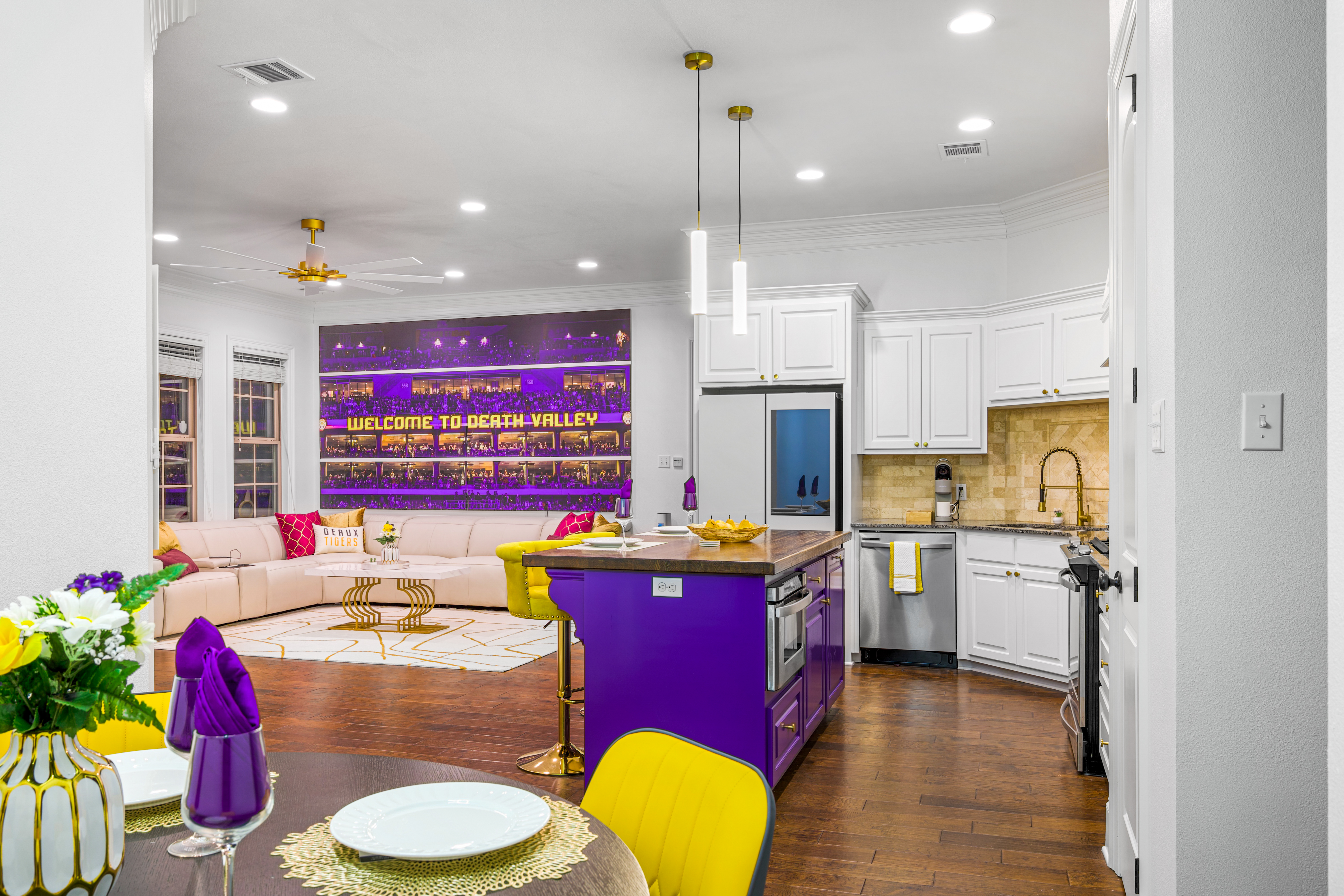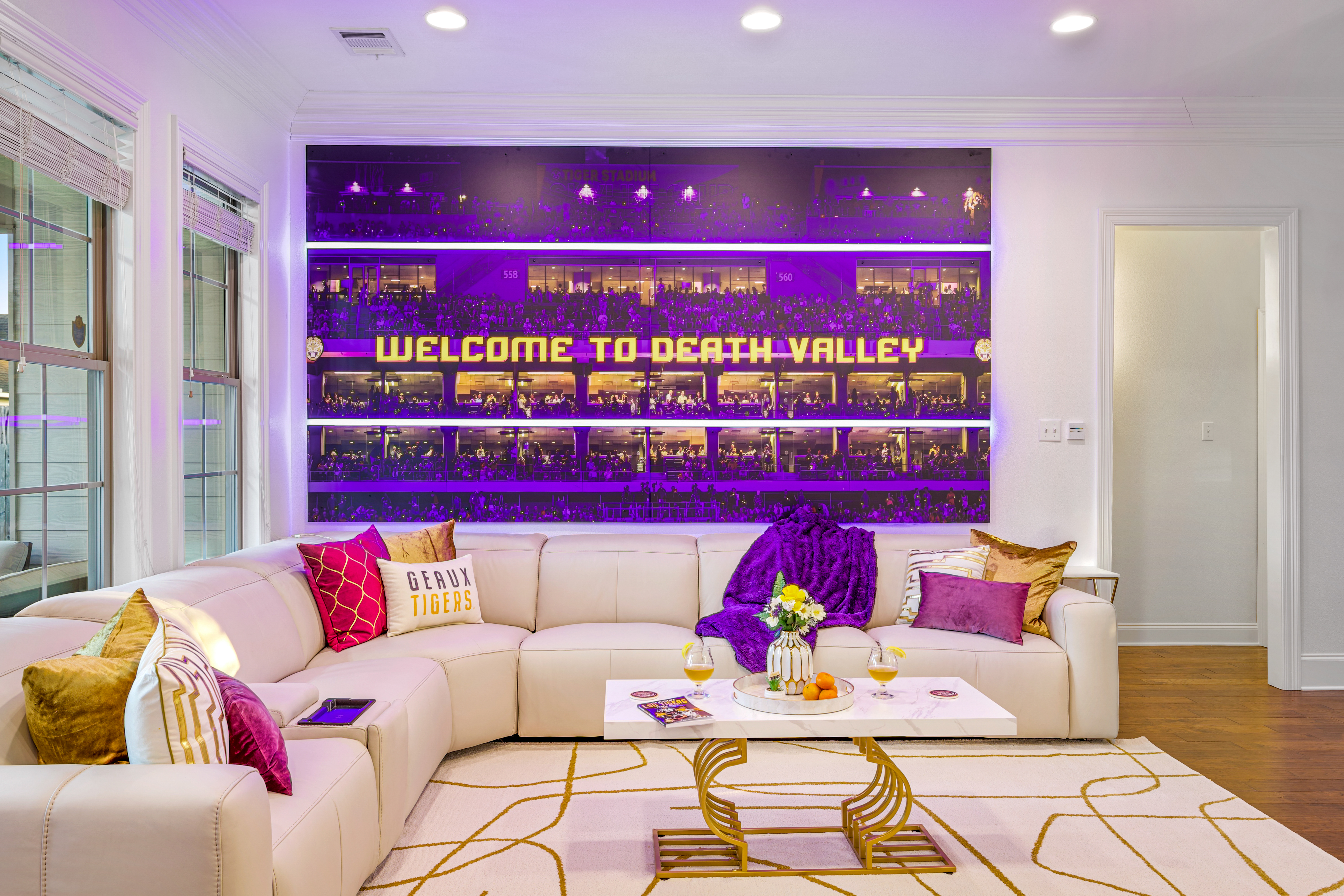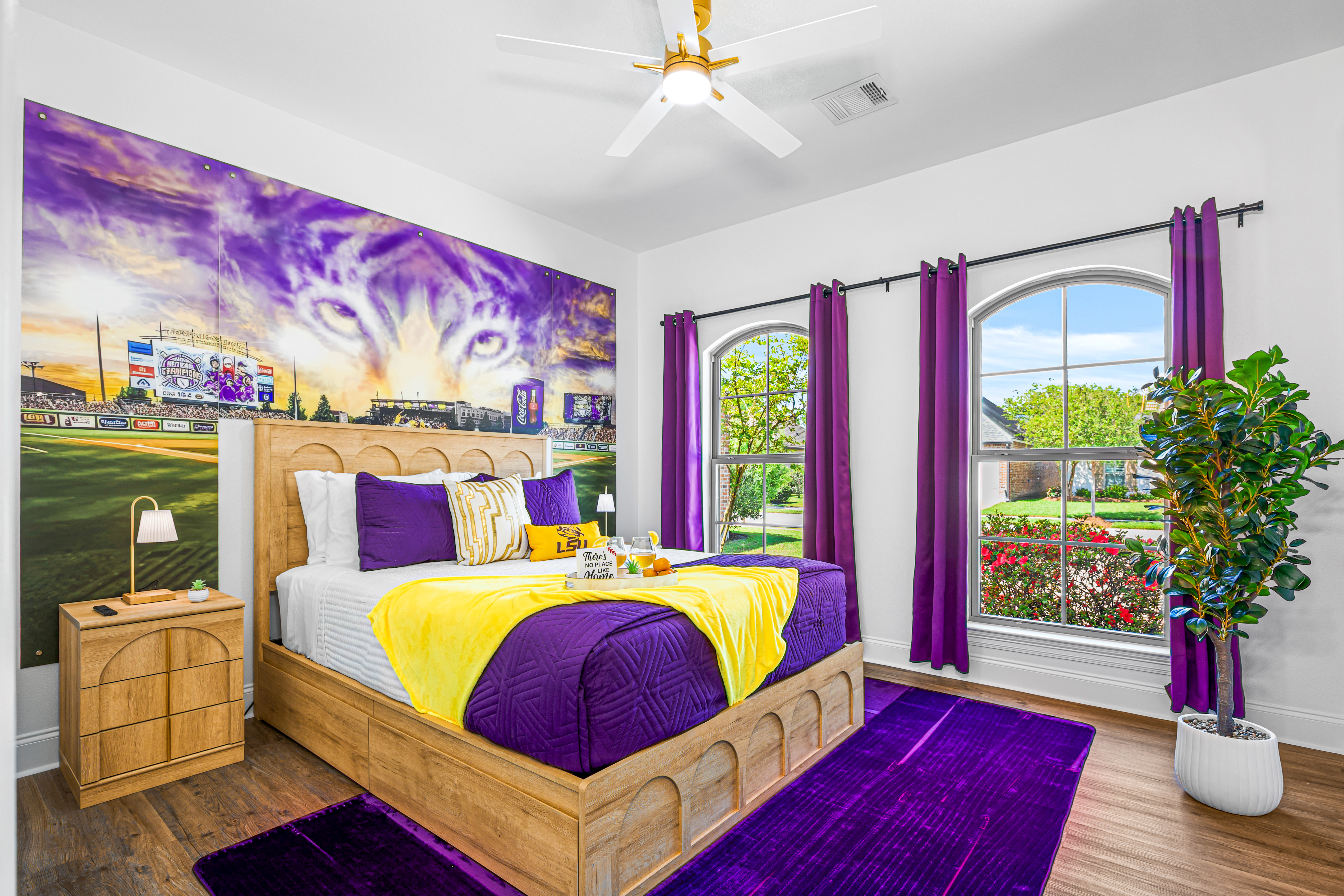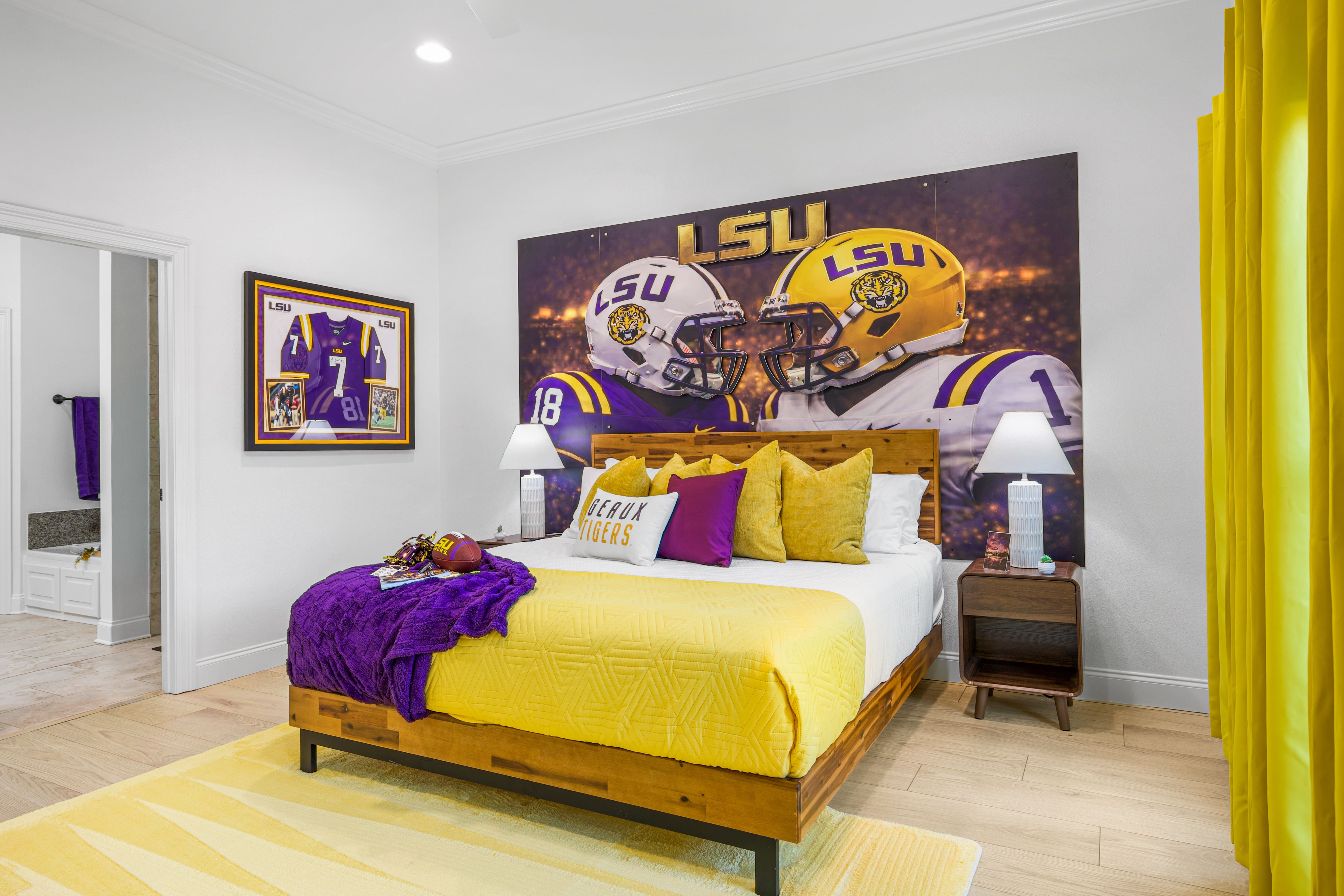 Every bedroom is uniquely LSU-inspired, giving each guest their own Tiger territory. From bold purple and gold accents to custom details that celebrate Baton Rouge spirit, this home fully immerses you to say Geaux Tigers!